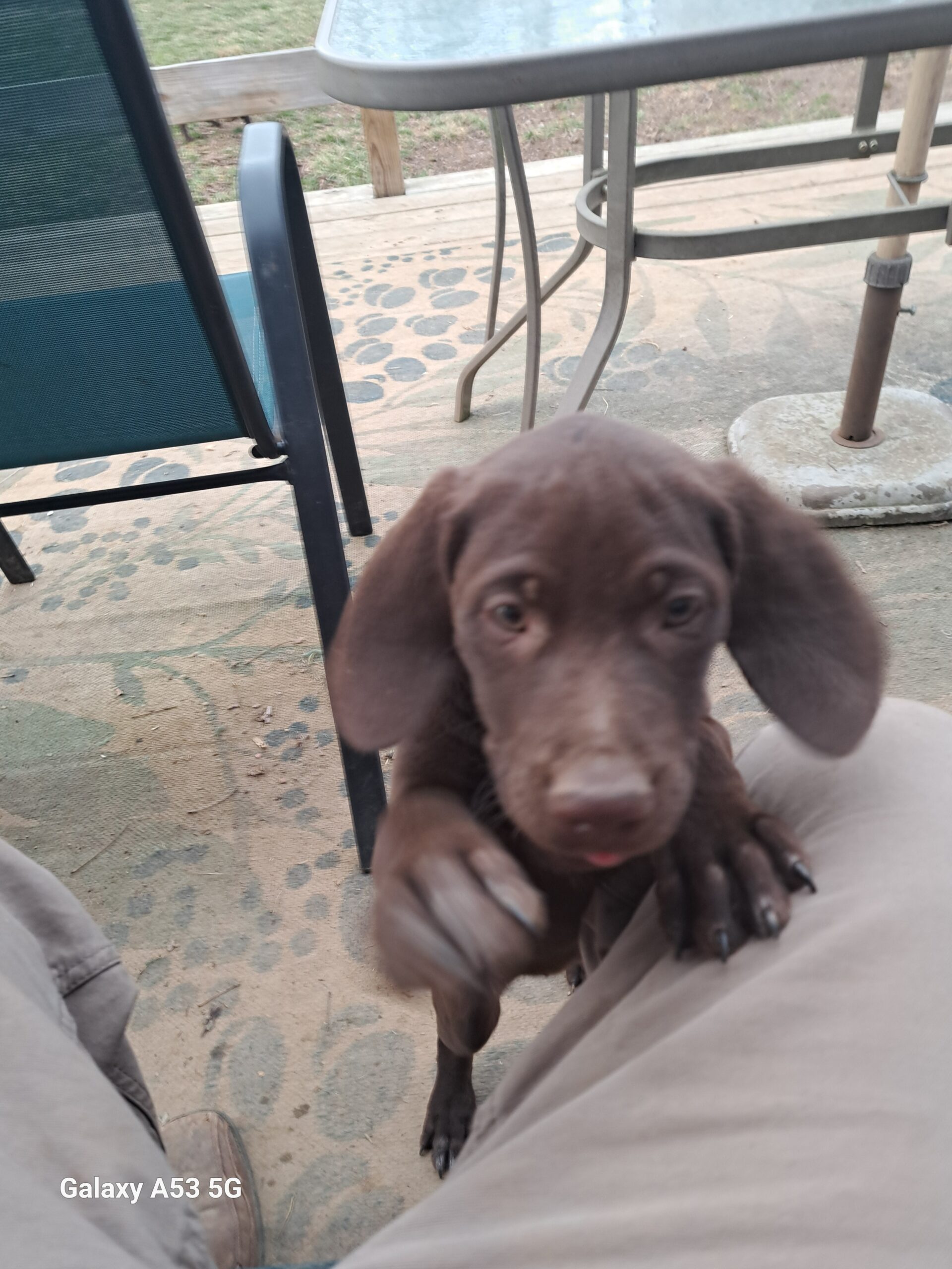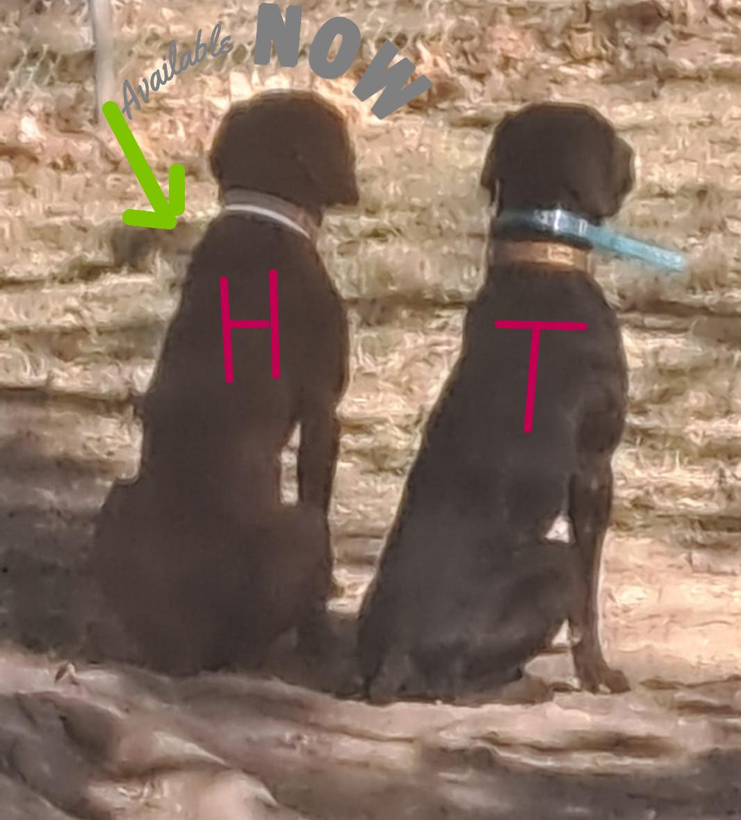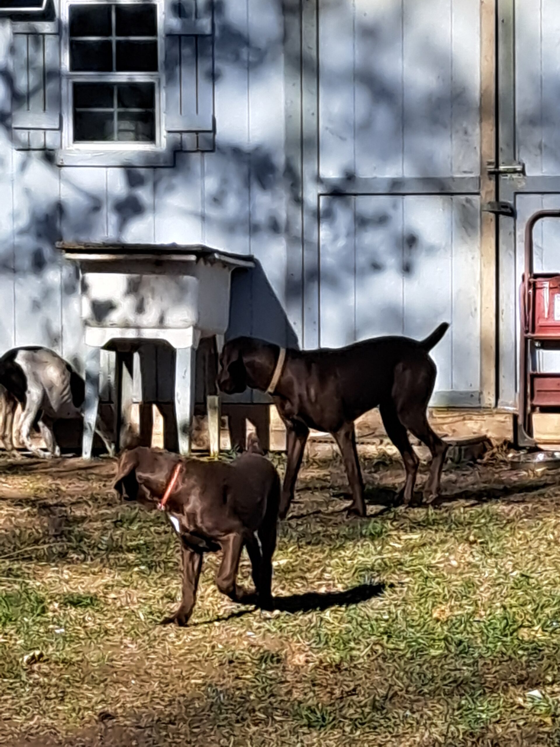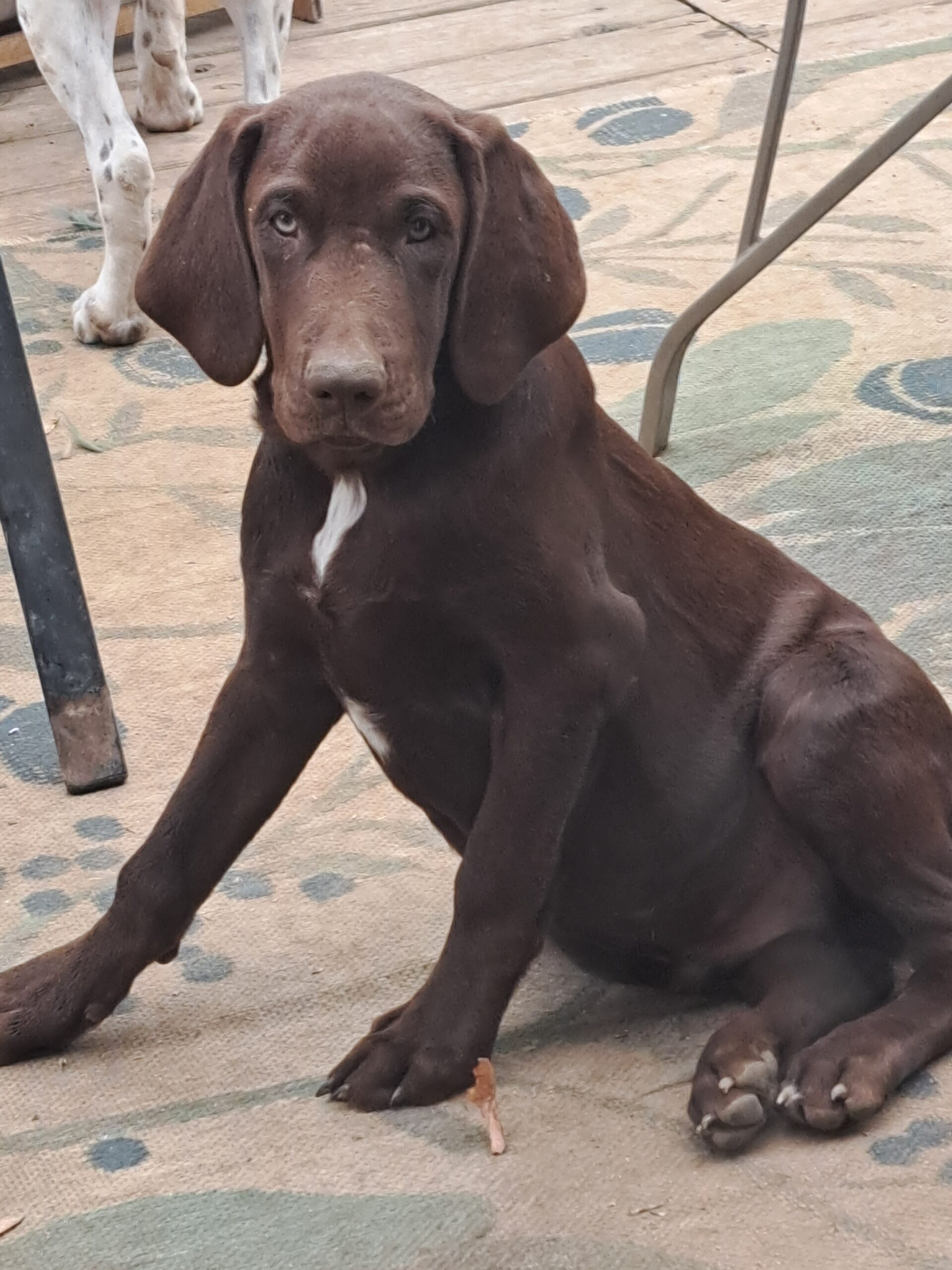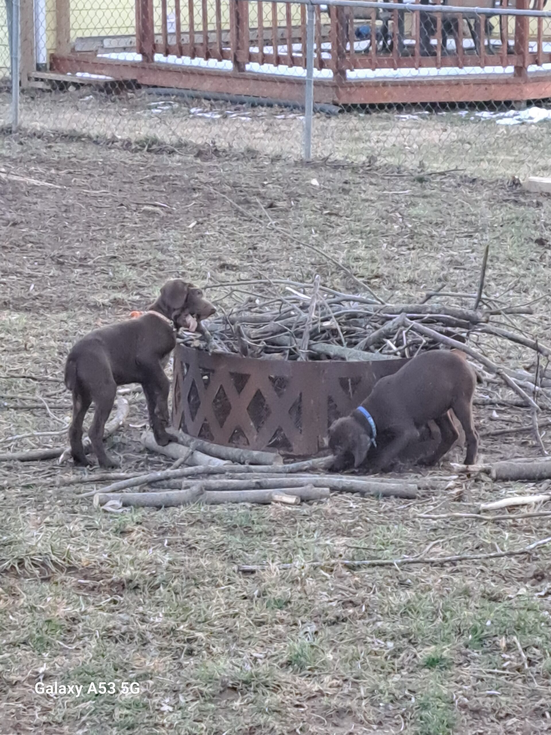 Some pictures of these 3 well-pedigreed German Shorthaired Pointers, Huckleberry, 13 months on the 7th. of January and Eli Liver Solid with White Blaze on Chest and his brother Elton, White and Liver! They were born July 15th, 2024.